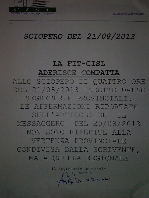 PER LA UILTRASPORTI PUO' BASTARE COSI' «PER NOI LA PROTESTA FINISCE QUI» - La nuova proclamazione dello sciopero è stata indetta dalle Segreterie Provinciali di Filt Cgil, Fit Cisl, Faisa Cisal e Ugl autoferro. Improvviso ed inatteso stop da parte della Uiltrasporti che ha deciso di interrompere la mobilitazione e di non unirsi alle altre sigle per la prosecuzione delle iniziative di lotta. C'è da registrare, invece, la presa di posizione della Fit Cisl che attraverso il proprio Segretario Regionale Alessandro Di Naccio (guarda), ha tenuto a chiarire che la Fit Cisl Abruzzo condivide le ragioni della mobilitazione dei lavoratori dell'Arpa di Teramo e che quindi la Fit Cisl aderisce compatta alla vertenza territoriale.