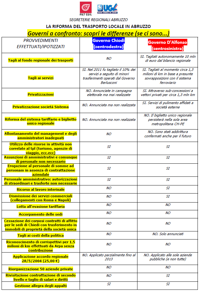 GOVERNO CHIODI E GOVERNO D'ALFONSO A CONFRONTO SULLA RIFORMA DEL TRASPORTO PUBBLICO LOCALE: SCOPRI LE DIFFERENZE (SE CI SONO) - I motivi dello sciopero di Filt Cgil e Ugl trasporti vanno ben oltre le accuse gratuite del Sottosegretario D'Alessandro - Preleva il calendario delle assemblee - Il servizio trasmesso da Rete8 - Rassegna stampa