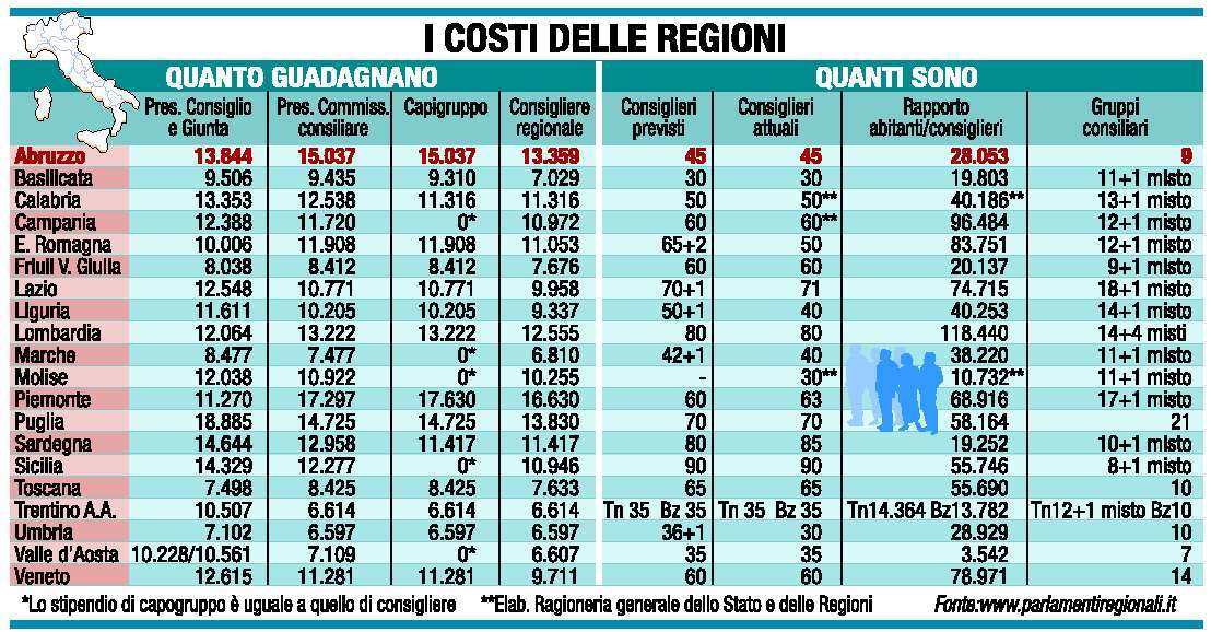 La Regione Abruzzo elargisce ai suoi rappresentanti politici gli stipendi più alti d'Italia: il governatore Gianni Chiodi e il presidente del Consiglio regionale Nazario Pagano guadagnano più dei presidenti di Basilicata, Calabria, Campania, Emilia, Friuli, Lazio, Liguria, Lombardia, Marche, Molise, Piemonte, Toscana, Trentino, Umbria, Valle d'Aosta e Veneto. E meno soltanto dei colleghi di Puglia, Sardegna e Sicilia. E l'Abruzzo addirittura sorpassa quasi tutte le altre regioni, con l'eccezione del solo Piemonte, per quanto riguarda gli stipendi dei presidenti di commissione consiliare, capigruppo e consiglieri semplici. In questi casi, e basta vedere la tabella accanto, tutte ma proprio tutte le regioni italiane ad eccezione del Piemonte, sono meno sciupone dell'Abruzzo. E non si tratta di pochi spiccioli di differenza: Chiodi e Pagano guadagnano cinquemila euro in più dei loro colleghi marchigiani, una differenza che corrisponde esattamente allo stipendio di un primario che sta per andare in pensione. E' un mistero inspiegabile che il consigliere regionale abruzzese prenda più del doppio del suo vicino marchigiano, di quello friulano, della Basilicata, del Trentino, dell'Umbria. Sbalorditivo quanto prendano i capigruppo abruzzesi rispetto ai colleghi di altre regioni: 15.037 euro in Abruzzo, cinquemila più che in Lazio, Liguria, Molise e Sicilia, mentre in Trentino, Umbria e Marche superano di poco i seimila euro. Se si considera che i gruppi consiliari sono nove di cui sei con un solo consigliere, la vergogna raddoppia (anche se nella passata legislatura i gruppi erano quindici e molti gruppi monodose sono stati creati apposta per far lievitare gli stipendi dei consiglieri). E se si considera che il pacchetto di voci non tassabili come diarie, rimborsi chilometrici, benefit e carte di credito variano dai 518 euro della Val d'Aosta ai 2.400 euro di partecipazione ai consigli regionali e 800 euro per i rimborsi chilometrici dell'Abruzzo, in tutto 3.200 euro nella regione governata dal Pdl, allora il conto davvero non torna.