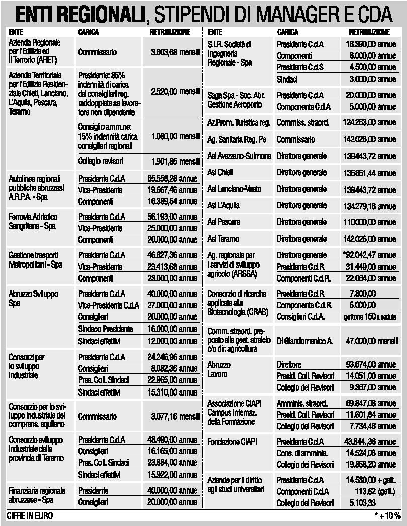 Quello aquilano è commissariato con Carlo Massecesi, dirigente regionale, che percepisce 3.077,16 lordi al mese. In quello teramano il presidente incassa circa 48mila e 500 euro annui, i consiglieri oltre 16mila, il presidente del collegio dei revisori dei conti circa 24mila, ed in sindaci circa 15mila.