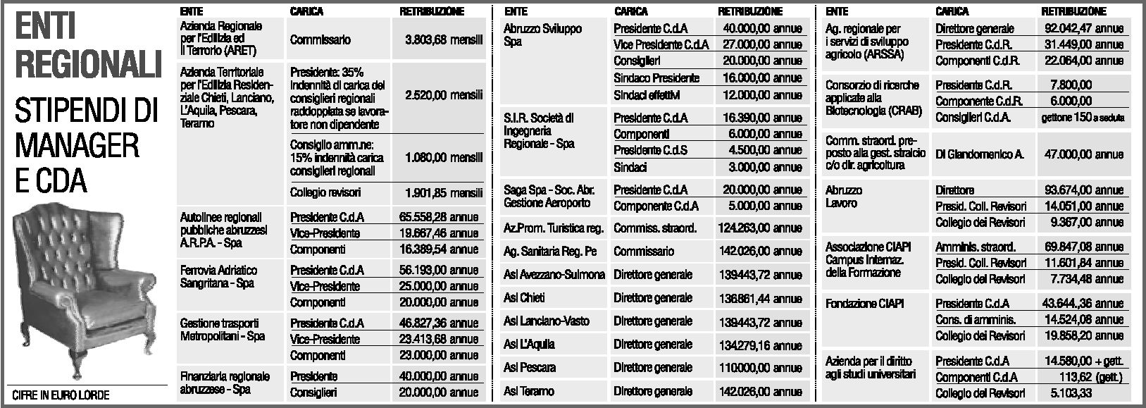 Gli enti in ballo, per citarne alcuni sono: i trasporti con Arpa, Gtm e Sangritana (tre società che dovrebbero essere unite in una sola); l'edilizia pubblica con l'Aret, e l'Arit; l'ambiente con l'Arta; il turismo l'Aptr; la gestione dell'acqua con le Ato: servizi all'industria con Abruzzo Engineering; l'occupazione con Abruzzo Lavoro; l'informatica con l'Arit; le società di formazione professionale come ad esempio il Ciapi. L'ambita finanziaria regionale Fira. I servizi all'agricoltura con l'Arssa; la gestione dell'aeroporto con la Saga. Poi ci sono le nomine più importanti, quelle ai vertici delle Asl che rappresentano un capitolo a parte.