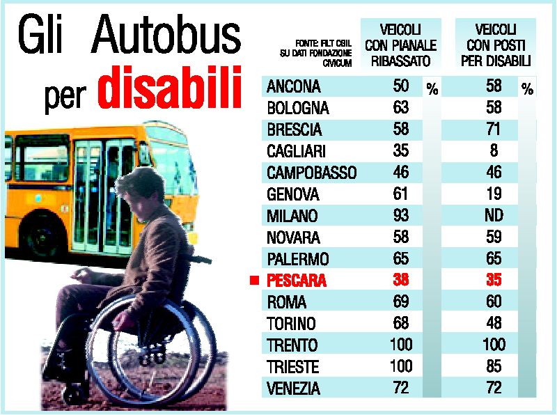 PESCARA. A Pescara solo un autobus su tre circolanti è predisposto per il trasporto dei disabili. L'allarme arriva dalla Filt Cgil di Pescara, che ha esaminato i dati di una ricerca condotta dalla Fondazione Civicum sui trasporti pubblici locali (vedi tabella allegata). La Fondazione, nota per avere svolto in passato alcune indagini sulla qualità dei servizi pubblici offerti ai cittadini, ha effettuato un'inchiesta a campione sul trasporto per i disabili in alcune città italiane. Su 15 controllate, Pescara è risultata penultima.