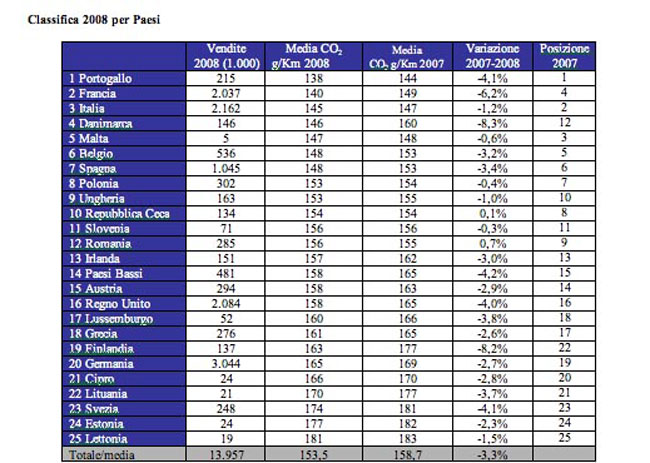 Lo studio T&E pubblica anche la classifica degli Stati in base all'efficienza media delle auto vendute: mentre il Portogallo si conferma nel 2008 al primo posto con un'emissione media dal nuovo parco macchine di 138 gCO2/km ed un miglioramento del 4,1% rispetto all'anno precedente, l'Italia (145 g, - 1,2%) perde il secondo posto, sopravanzata dall'incredibile prestazione della Francia (140 g, - 6,2%). Gran Bretagna e Germania (complessivamente il 36% del mercato europeo) si collocano nella parte alta della classifica, rispettivamente con 159 g e 166 g, livelli molto superiori alla media comunitaria (153,5 g).