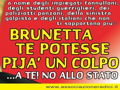 ROMA - «Ministro Brunetta hai offeso gli italiani, vattene!». È questo lo slogan che ha accompagnato stamattina, la protesta dell'associazione Radici, che in piazza San Giovanni, ha portato un camion pubblicitario con l'esplicito invito, diretto appunto al ministro della Pubblica amministrazione, di dimettersi. «A nome degli impiegati fannulloni, degli studenti guerriglieri, dei poliziotti panzoni, della sinistra golpista e degli italiani che non ti sopportano più: Brunetta te potesse pijà un colpo....a te no allo Stato», è lo slogan affisso, a carattere cubitali, sul camion.