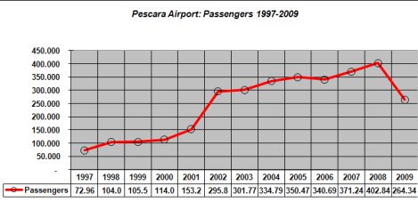 PESCARA. Da 105 mila passeggeri del 1999 a 350 mila del 2005. E poi il lento declino dell'aeroporto d'Abruzzo fino ai 264 mila passeggeri stimati per il 2009. (vedi grafico allegato)