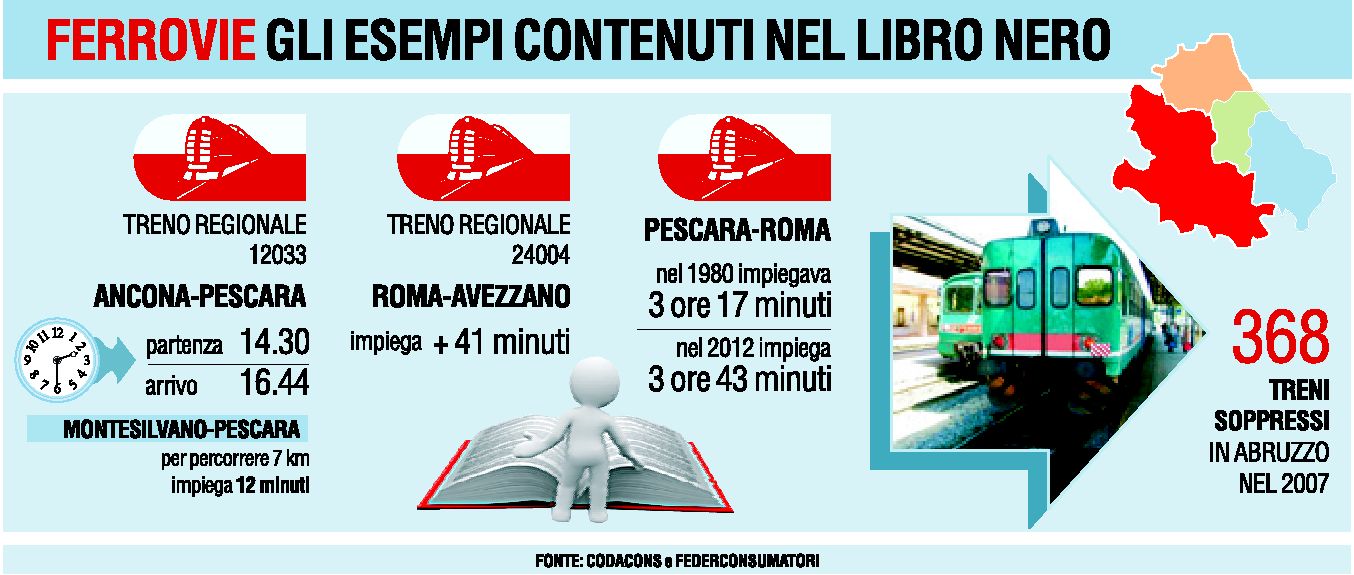 Il libro nero delle ferrovie abruzzesi. Federconsumatori e Codacons hanno redatto per il terzo anno consecutivo il “Libro nero” del sistema ferroviario abruzzese.