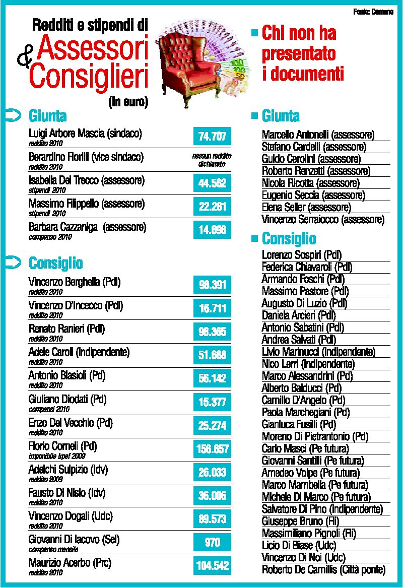 Comune, il 70% dei politici non svela i redditi. Albore Mascia ha denunciato 74mila euro. Il più ricco è Corneli (Pd) con 156mila, lo segue Acerbo (Prc) con 104mila