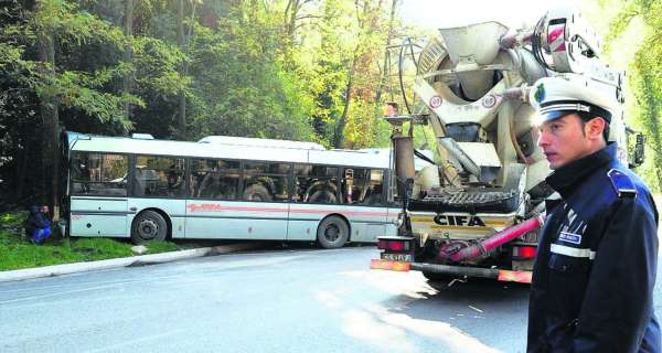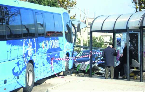 Bus impazzito investe una donna. Nella sua corsa il pullman sale sul marciapiede e abbatte una pensilina
