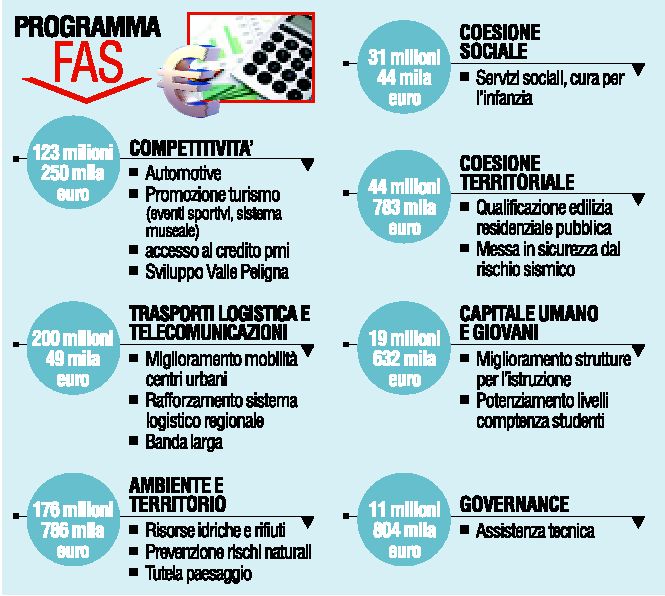 Fondi Fas. Il 76% dei 608 milioni concessi sarà investito in trasporti, telecomunicazioni e logistica. «Cari imprenditori, basta lamenti» Chiodi alle forze produttive: ora che i soldi ci sono, presentate progetti di qualità. Fondi Fas, come saranno impiegati