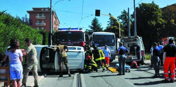 Bus travolge un'auto, traffico in tilt. Il Suv finisce su un fianco, soccorsi sotto gli occhi di una folla di curiosi