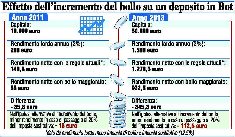 Supertassa sui Bot: su 10mila euro si perdono tre quarti del reddito. Ecco gli effetti dell'aumento dell'imposta di bollo sui conti titoli.