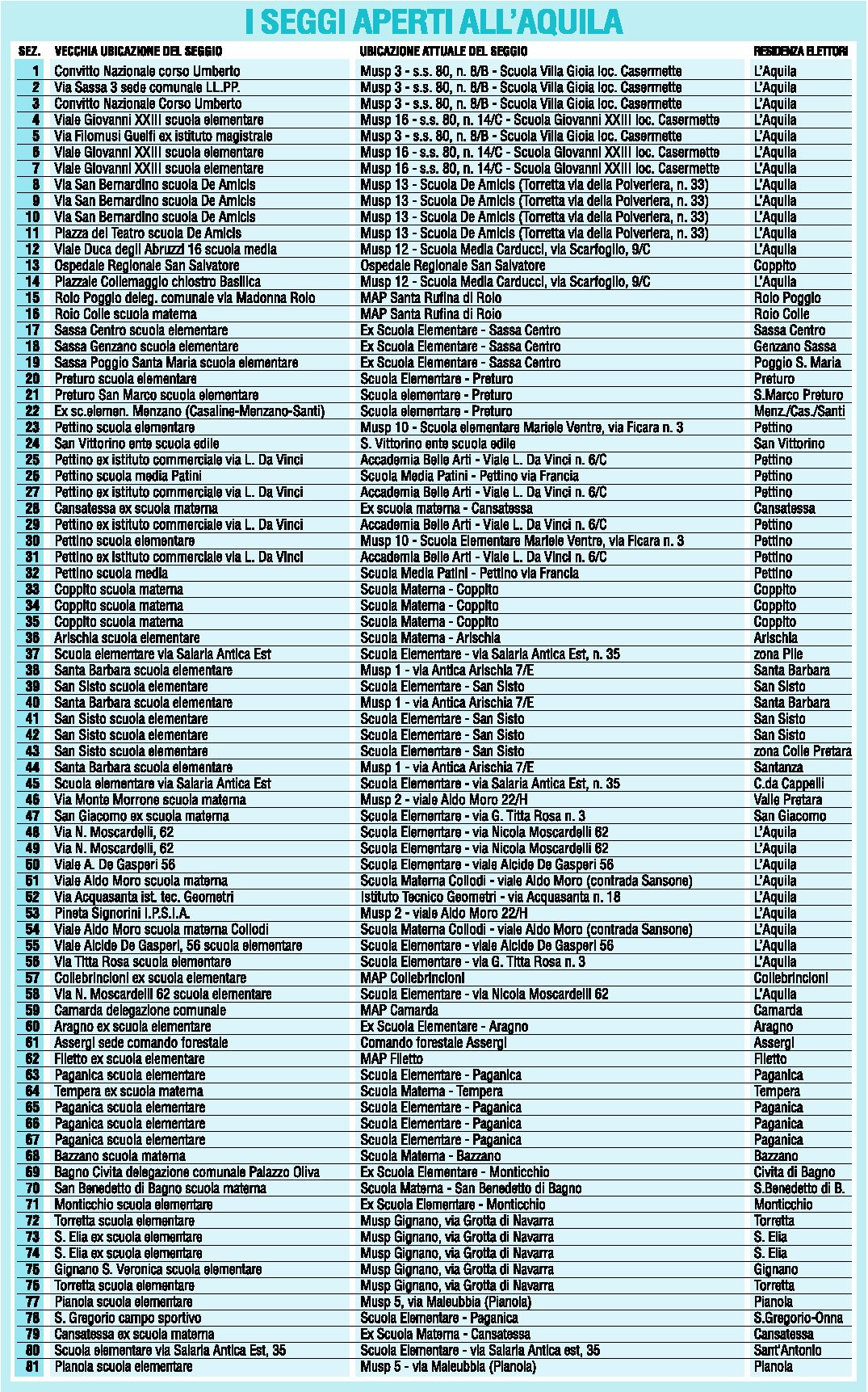 Ecco gli 81 seggi dislocati a L'Aquila e nelle frazioni -