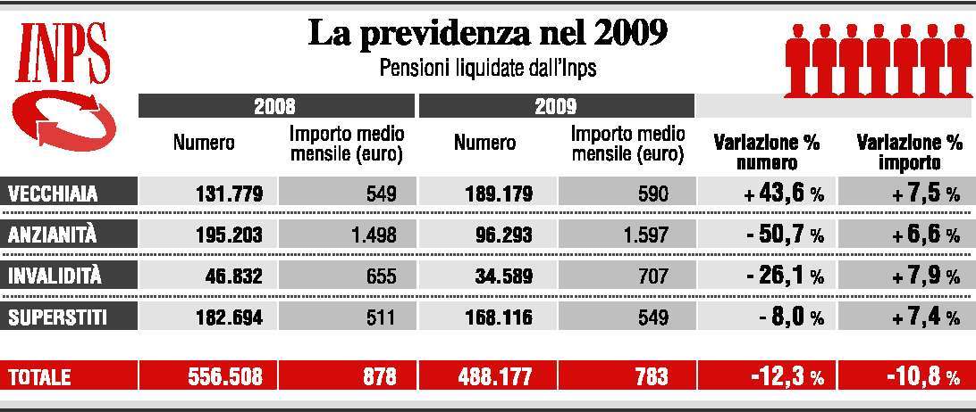 Meno pensioni, avanza il contributivo. Nel 2009 dimezzata l'anzianità, il totale dei nuovi trattamenti in calo del 12% -