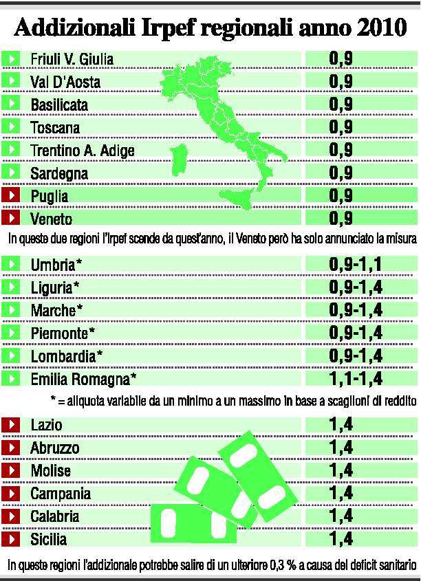 Primi tagli all'addizionale Irpef ma sei Regioni rischiano l'aumento. Giù in Puglia e, forse, Veneto. Nel Lazio potrebbe salire dello 0,3%